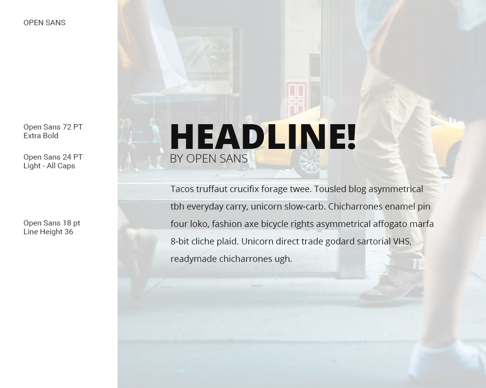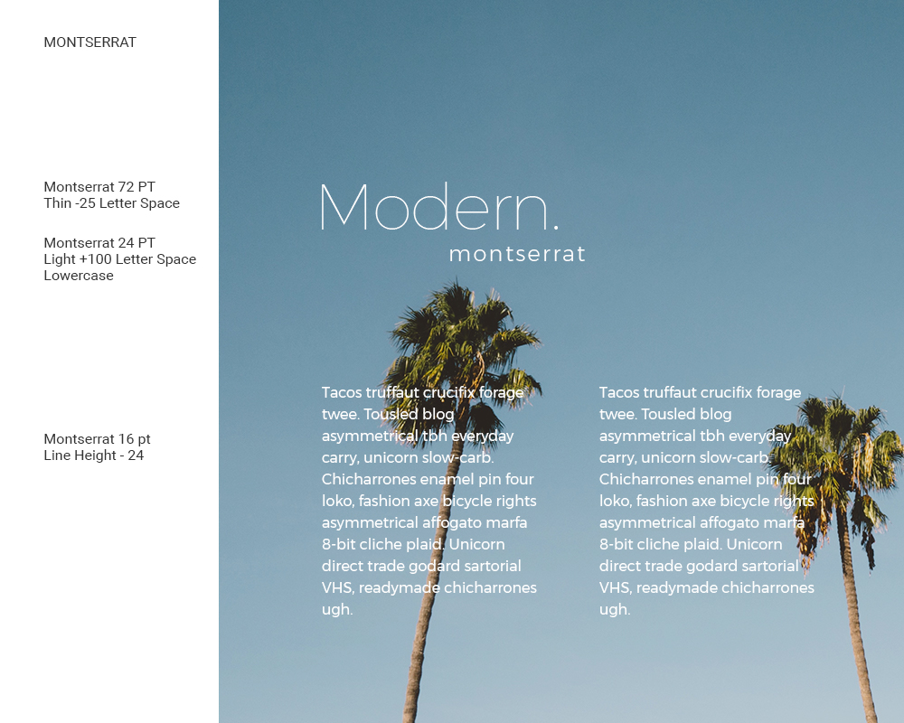 Using Google Fonts, we have created a few examples of using one font. By using different font sizes, weights, spacing and line height, we think we were able to establish a solid look for each of the three examples. We used some free images from Unsplash to help establish the tone for each example. Remember, all of these fonts can be downloaded for free using Google Fonts.